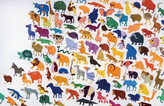 子どもの頃、壁の幾何学模様を見て動物や人の形に見えたりよく想像したりして遊んだこと、たった一種の動物が生態系をごっそり動かすことがあると聞いて大群や大移動というものに魅力を感じたこと、そこから生まれた動物のデザイン。実際にはありえない動物の群衆を面白い形と色で描いています。