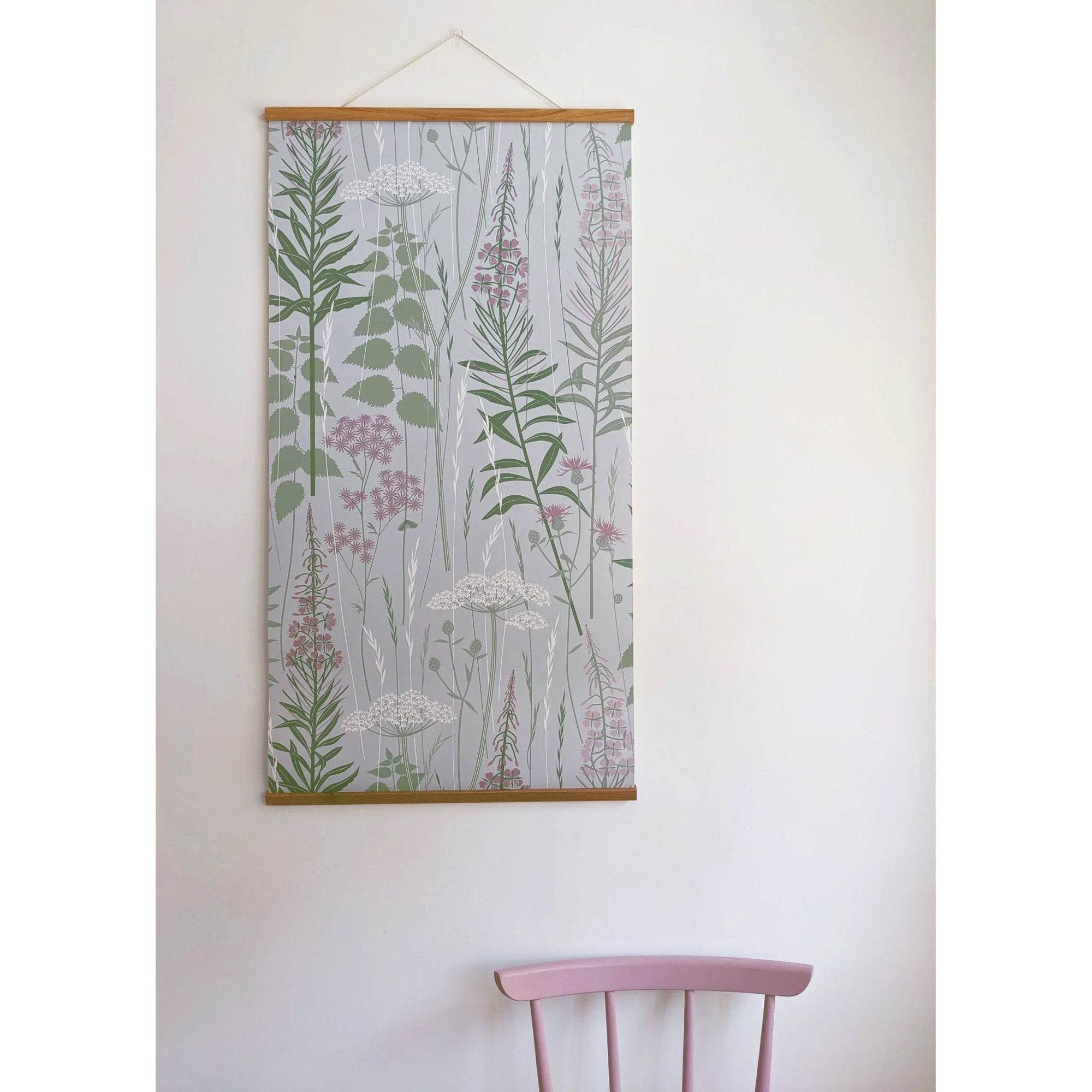 Hannah Nunn(ハンナ・ヌン)の新作壁紙「Wild Edge(ワイルド・エッジ)」は、夏の草原で見つけられる植物に焦点をあてています。そこには、ローズベイ・ウィローハーブ(ヤナギラン)、ヤグルマギク、イラクサといった自然の中に息づく草花や小さな昆虫たちの世界があります。この壁紙のカラーネームはFull Bloom(フル・ブルーム)。やさしいブルーグレーの背景に、緑の葉とピンク・ホワイトの花々が満開に咲いています。野の息吹を感じさせる、自然豊かなデザインです。