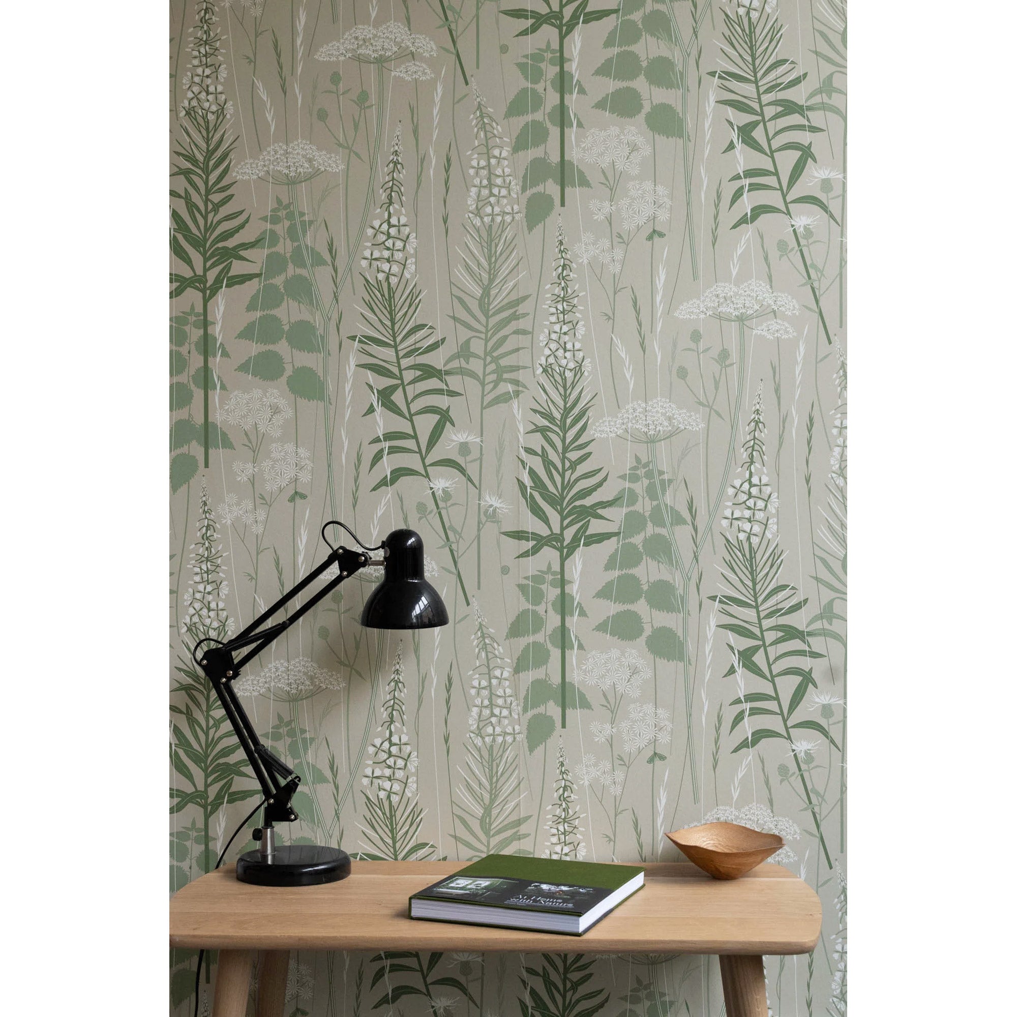 Hannah Nunn(ハンナ・ヌン)の新作壁紙「Wild Edge(ワイルド・エッジ)」は、夏の草原で見つけられる植物に焦点をあてています。そこには、ローズベイ・ウィローハーブ(ヤナギラン)、ヤグルマギク、イラクサといった自然の中に息づく草花や小さな昆虫たちの世界があります。この壁紙のカラーネームは Nettle(ネトル-イラクサ)。グレージュの背景に、グリーンの葉・ホワイトの花々が満開に咲いています。野の息吹を感じさせる、自然豊かなデザインです。