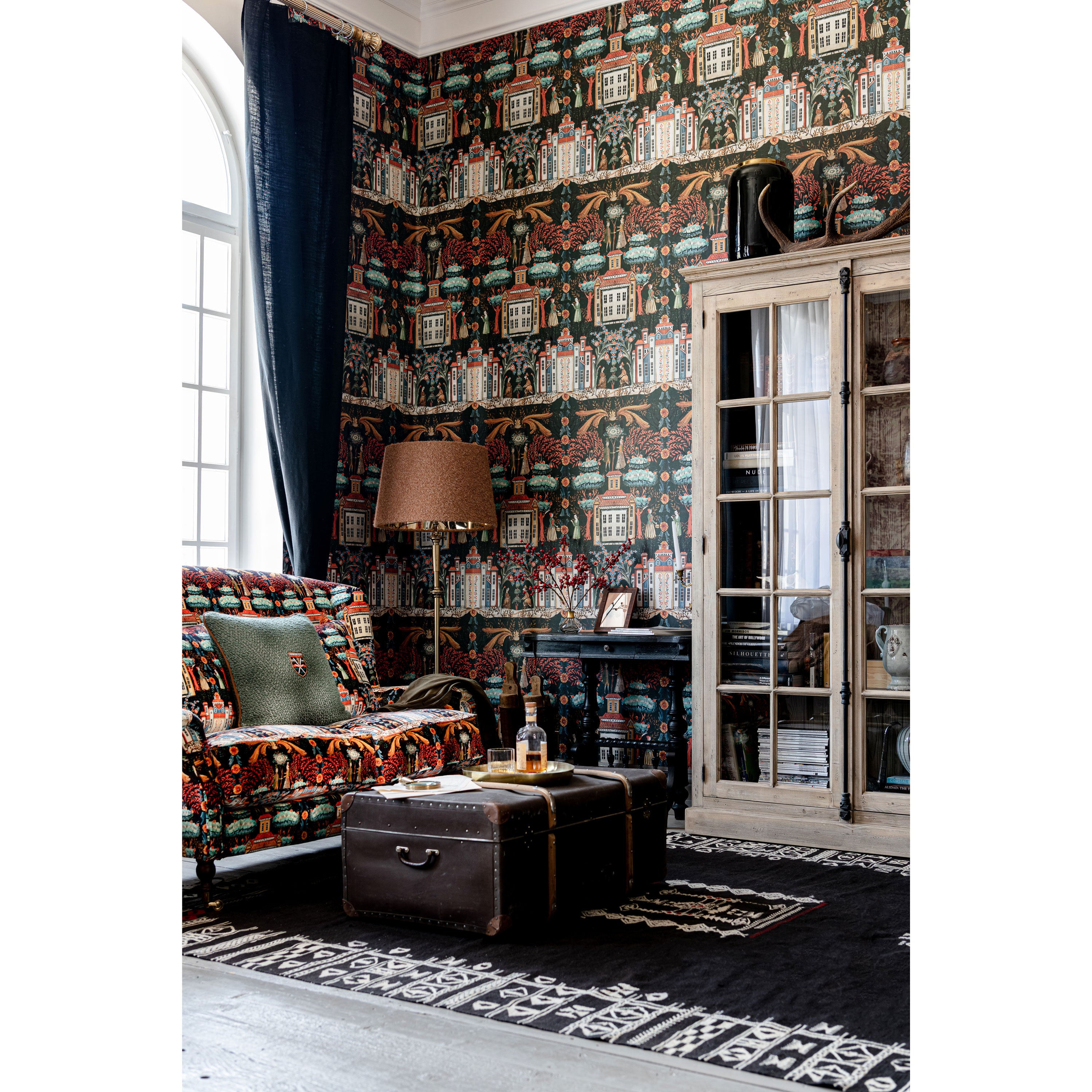 チロルの建築物と村の人々が幻想的な葉の天蓋の下で一緒になる魔法のようなデザインです。伝統的な衣装を着たバラ色の魅力的なキャラクターは、宝石のような色合いの木々や花に囲まれた架空の町に住んでいます。