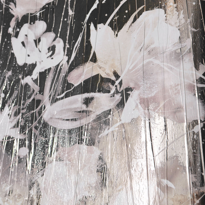 フェミニンなラインの花の水彩画をシワ加工が施されたホイル調素材にプリントしています。