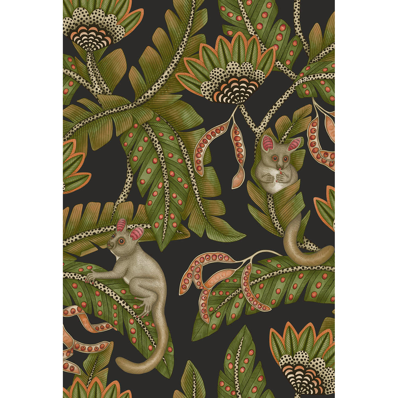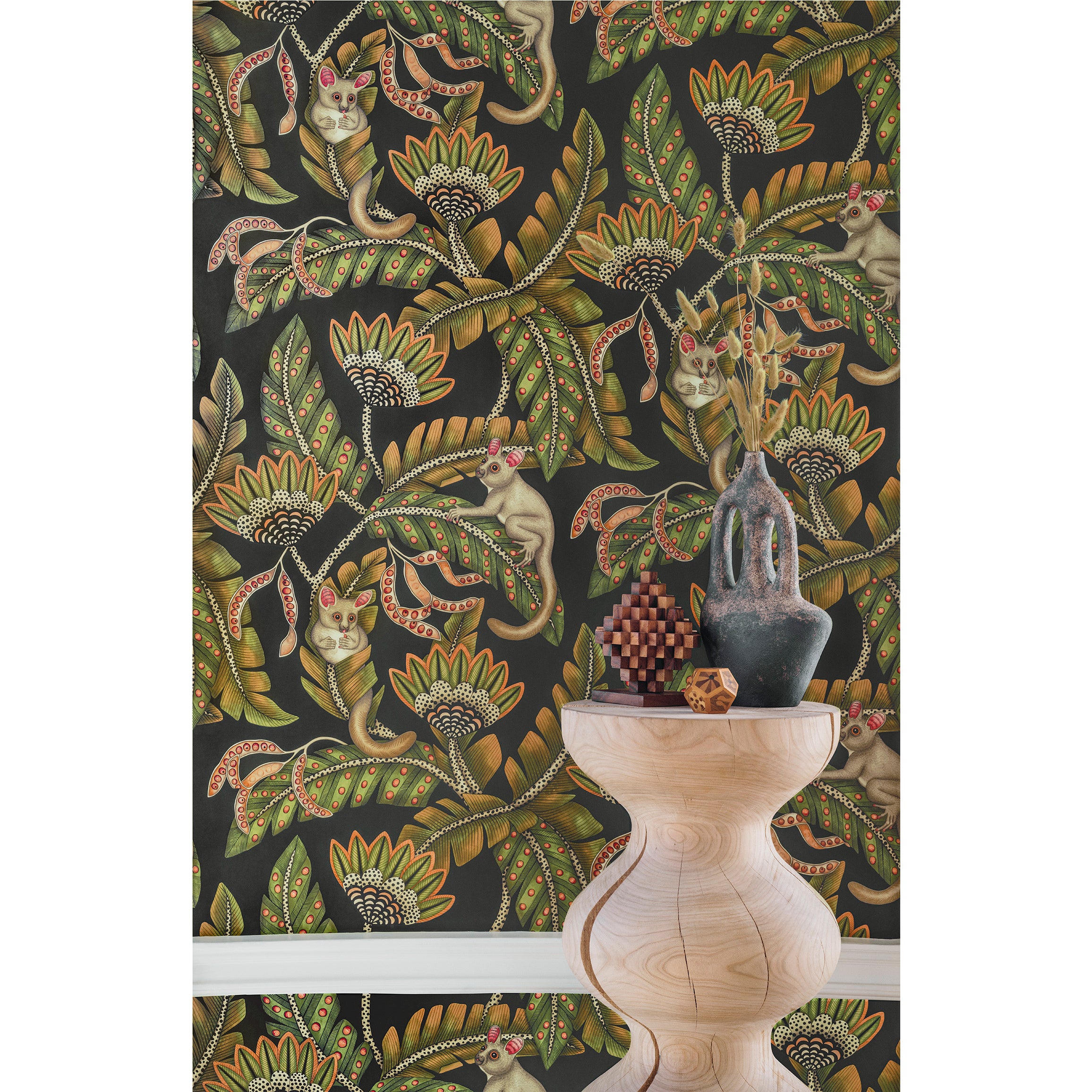 ブッシュベイビーのカラーウェイは、緋色とオレンジ色がポップな熱帯雨林の緑、豊かなワインの色調、そして穏やかなアクアマリンを特徴としています。これらの遊び心のある生き物の夜行性に似た真っ黒な地面の色合い。