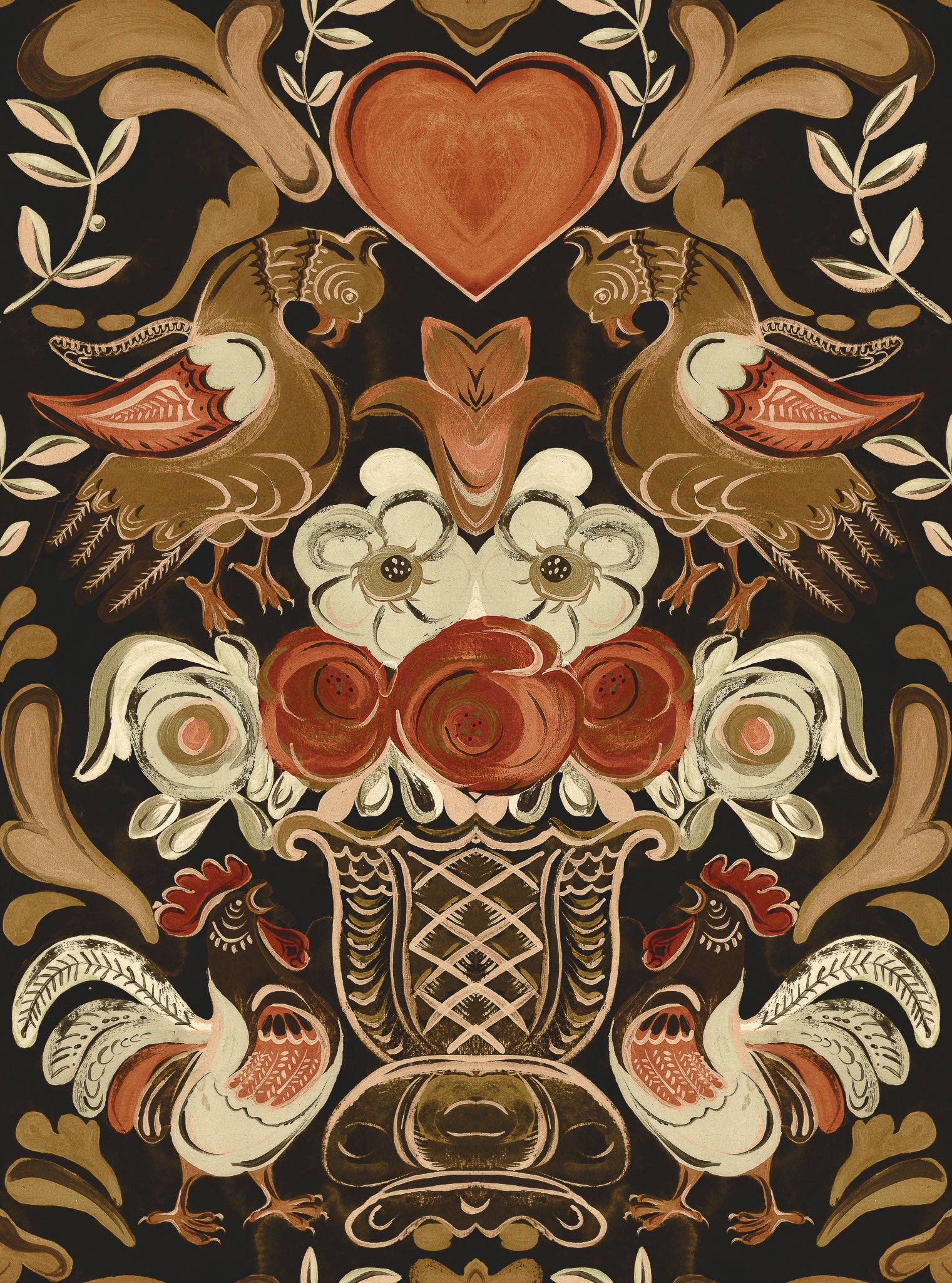 ブラッシーで美しい、生命力あふれるな民俗的なデザインは、空想の金色の鶏と活気を感じるおんどりが、咲き誇る花が挿された壷をとりまいています。伝統的なチロルの物語にインスパイアされたこのデザインは、『GOLDEN HENNE』の壁紙を支配するゴールドの色合いで描かれ、ルビーレッドのハートがロマンティックです。