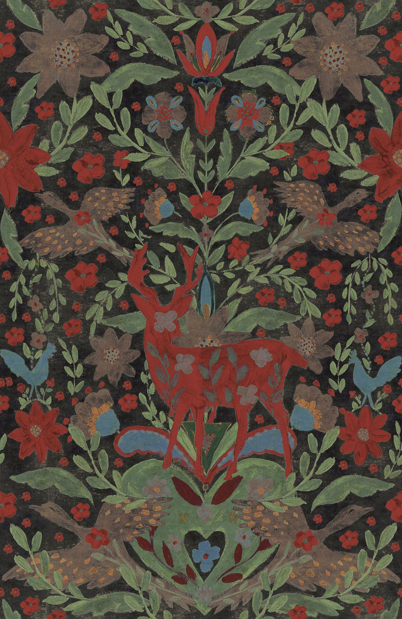 キングを意味するDER KÖNIGは、チロル地方の山の主が描いた美しいハンドペイントのイメージ。神秘的な鳥が飛び立つと、淡い雪や夜中の暗闇を背景に現れる雄鹿の群れ。映える花や葉のシルエットはカーペットのような柄ゆきです。