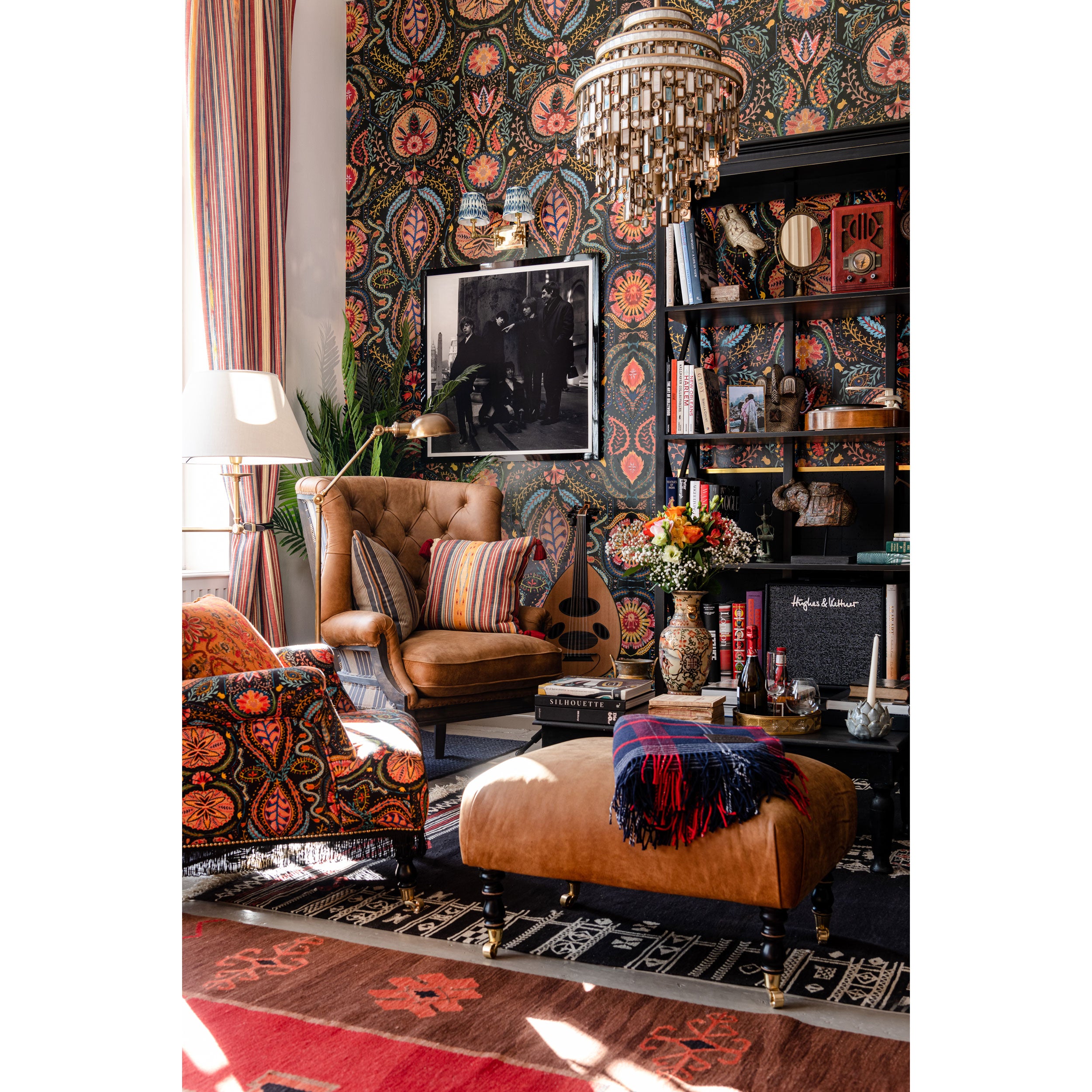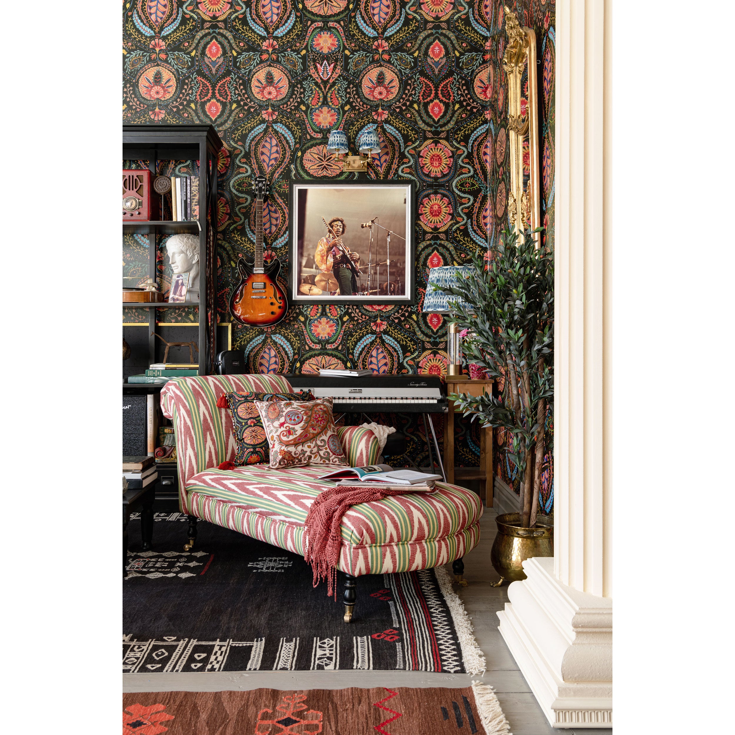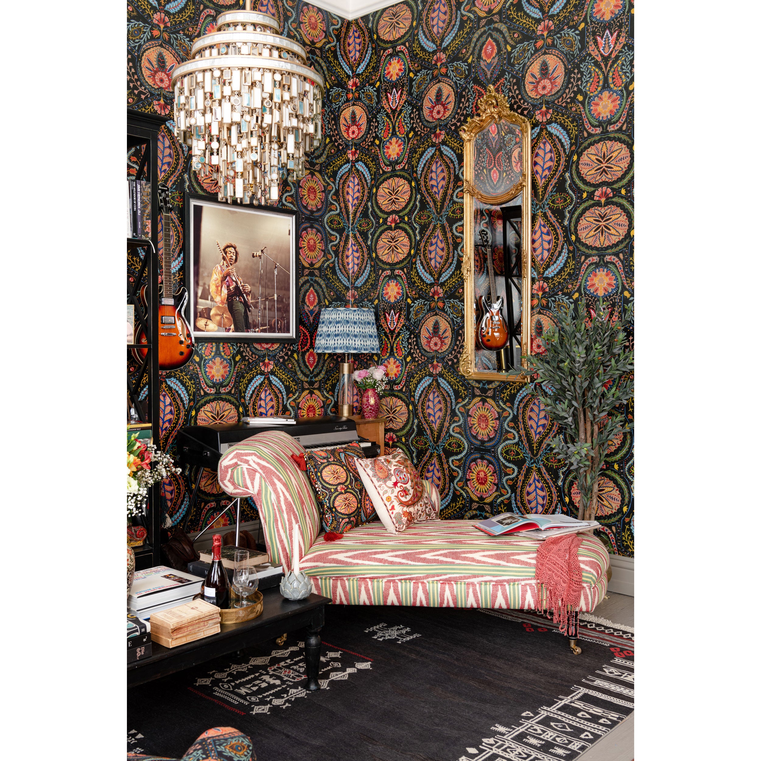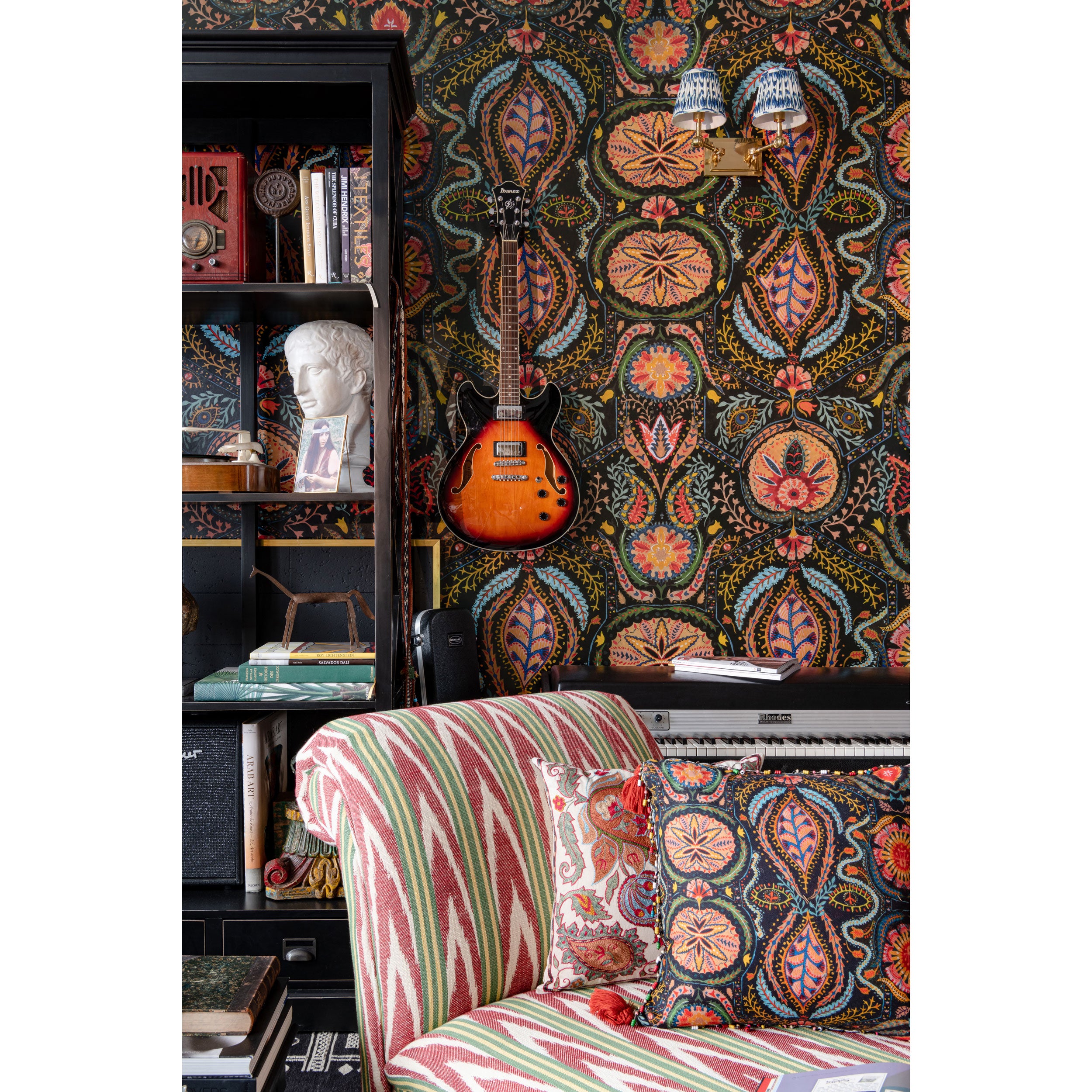 ダークカラーの背景に彩度の高いカラーの糸で刺繍が施されたデザイン。