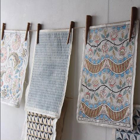 手漉き和紙にも似たベースに、木版、手塗り、ステンシルで色付けして、このアトリエから届けられるー枚ー枚が一点ものなのです。印刷の工程上できる印刷がなされていないミミの部分も愛らしく、ジョイントカットせずにこのまま張り連ねても味わいがあります。もちろん、カルトナージュや、手漉きの風合いを活かしてランプシェードにしてもセンスが光るでしょう。