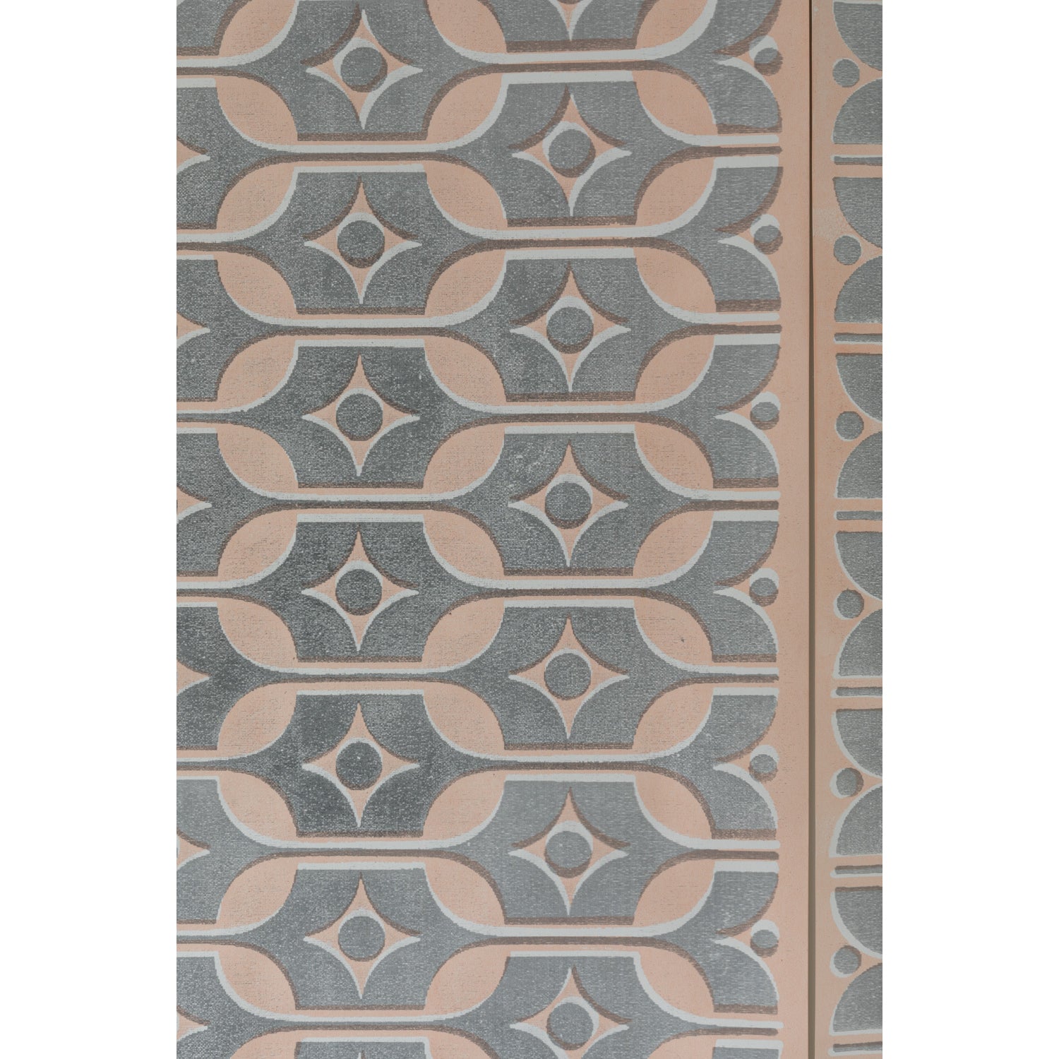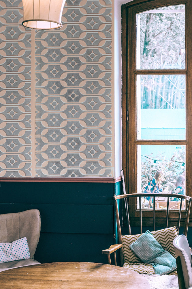 陶器のデザインが壁紙へとリデザインされて、ヴィンテージな美しい世界観を醸し出しています。
