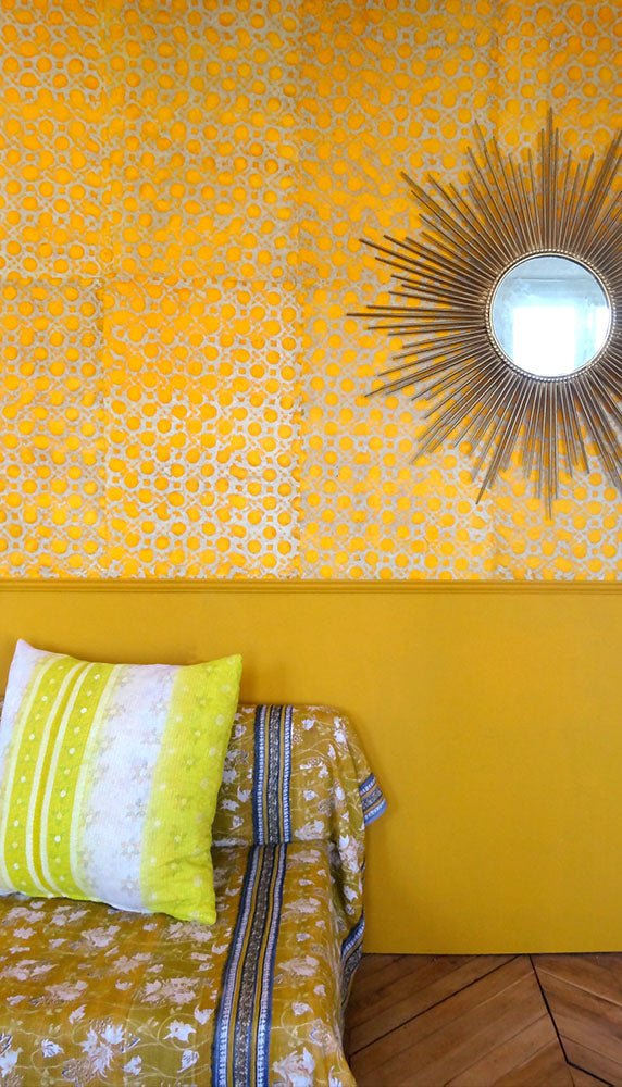 WALLPAPERは蝋纈(ロウケツ)染めの技術を用い、フランスでリデザインされ、ネパールで作られています。