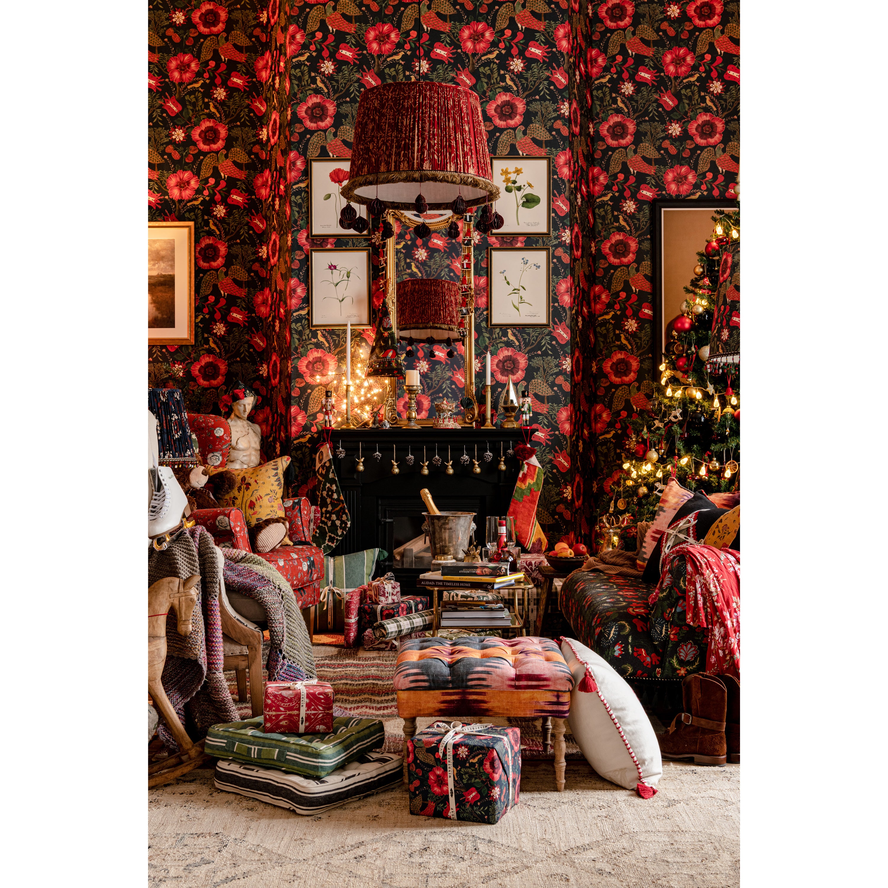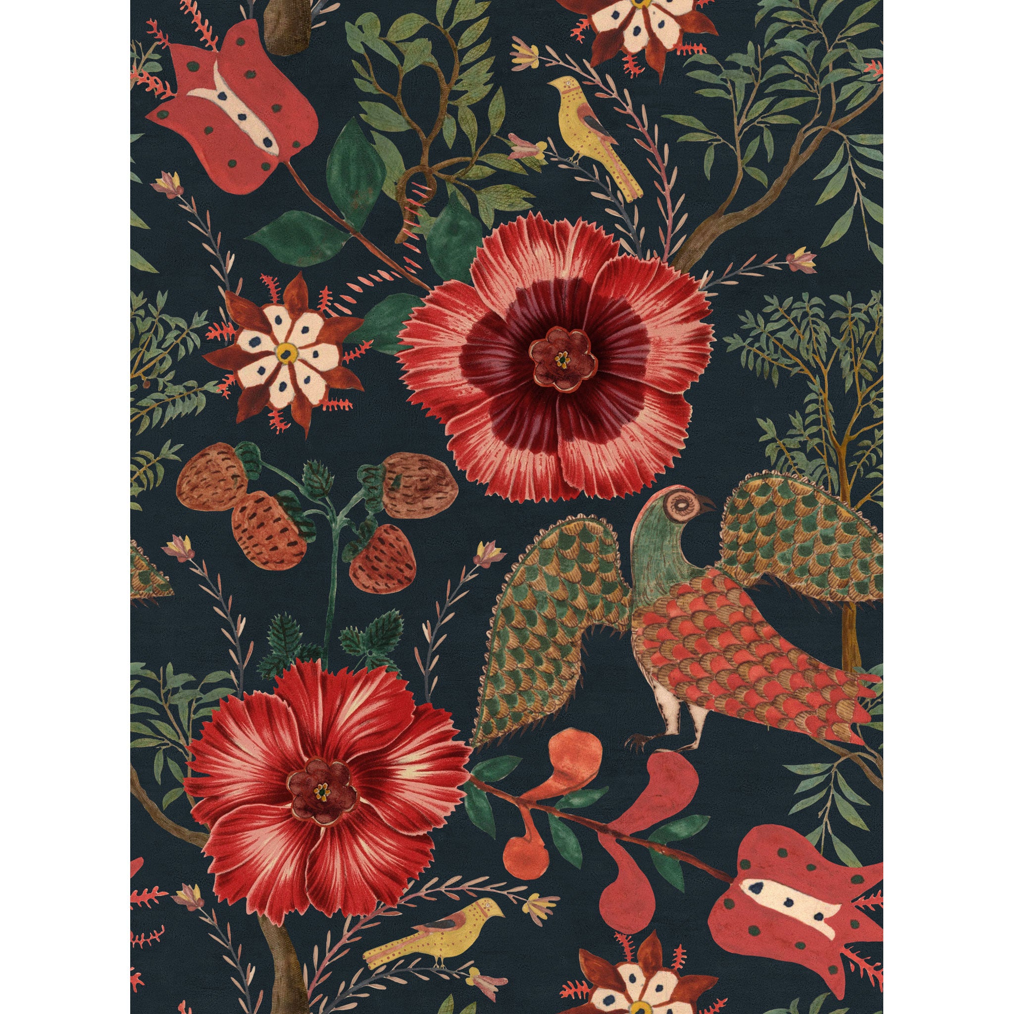 ダークカーラーのベースにコントラストの強い大きな花と枝葉、工芸品のような鳥が際立ち、大胆な壁紙デザインを生み出しています。