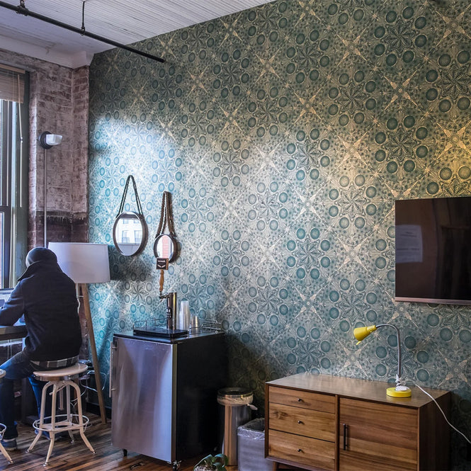 フライングVギターやスピーカー、ドラムといった音楽モチーフを組み合わせた、万華鏡のような幾何学デザイン。まさにロックンロールの魂を叫ぶようなこの壁紙。空間を本気でロックさせたいなら――迷わず、このデザインを。