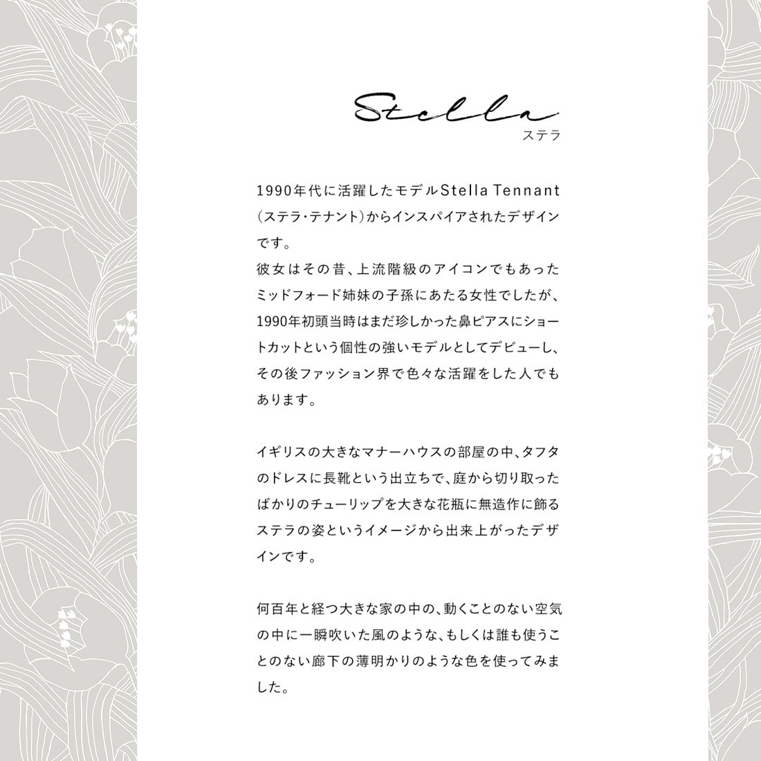 1990年代に活躍したモデルのStella Tennantからインスパイアされたデザインです。