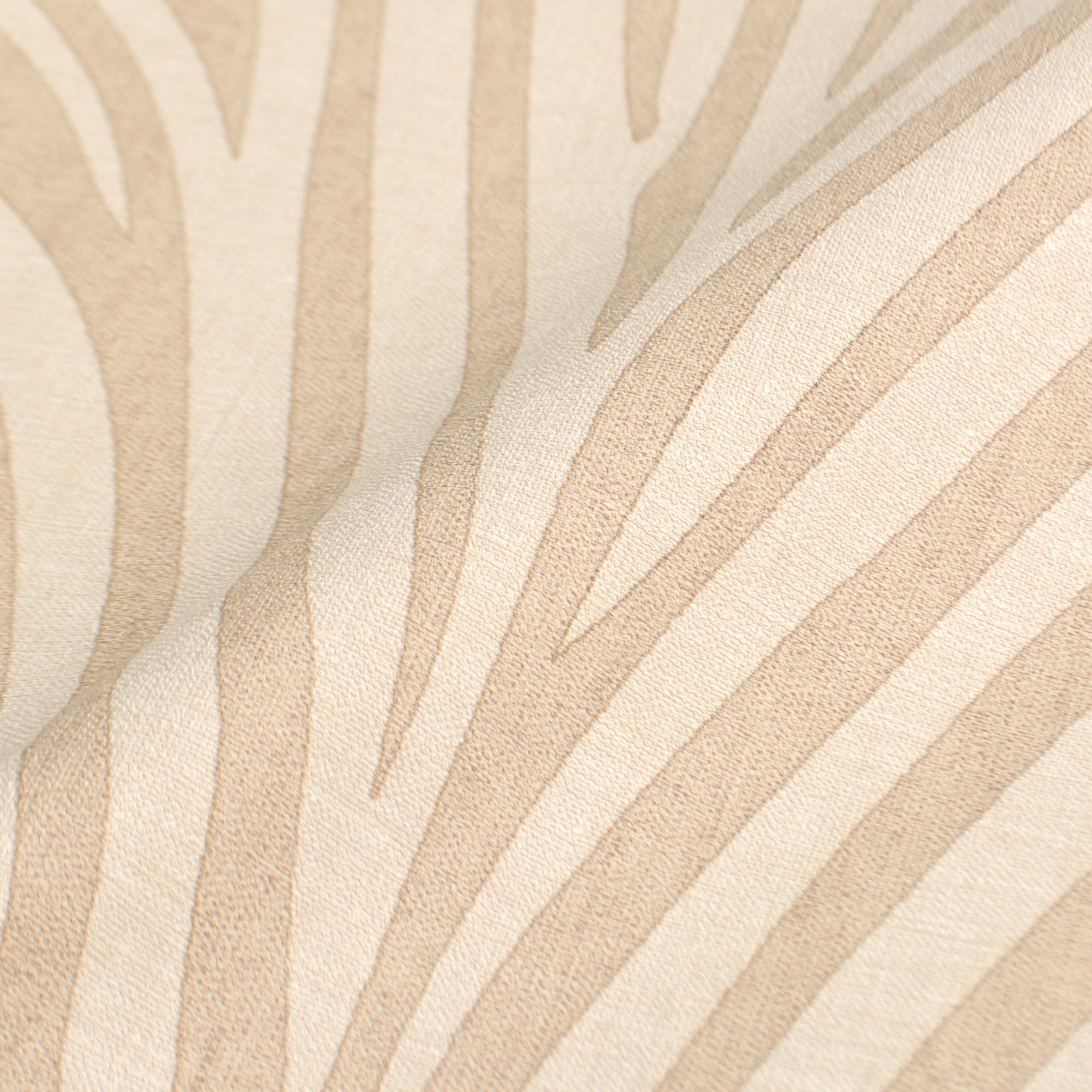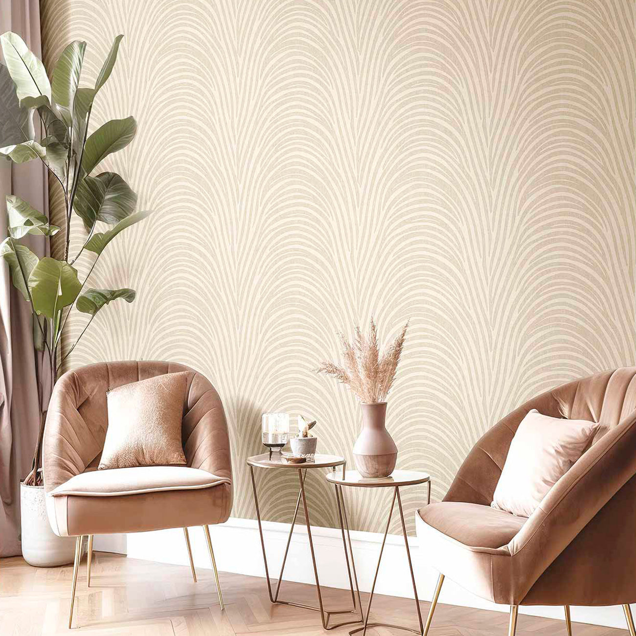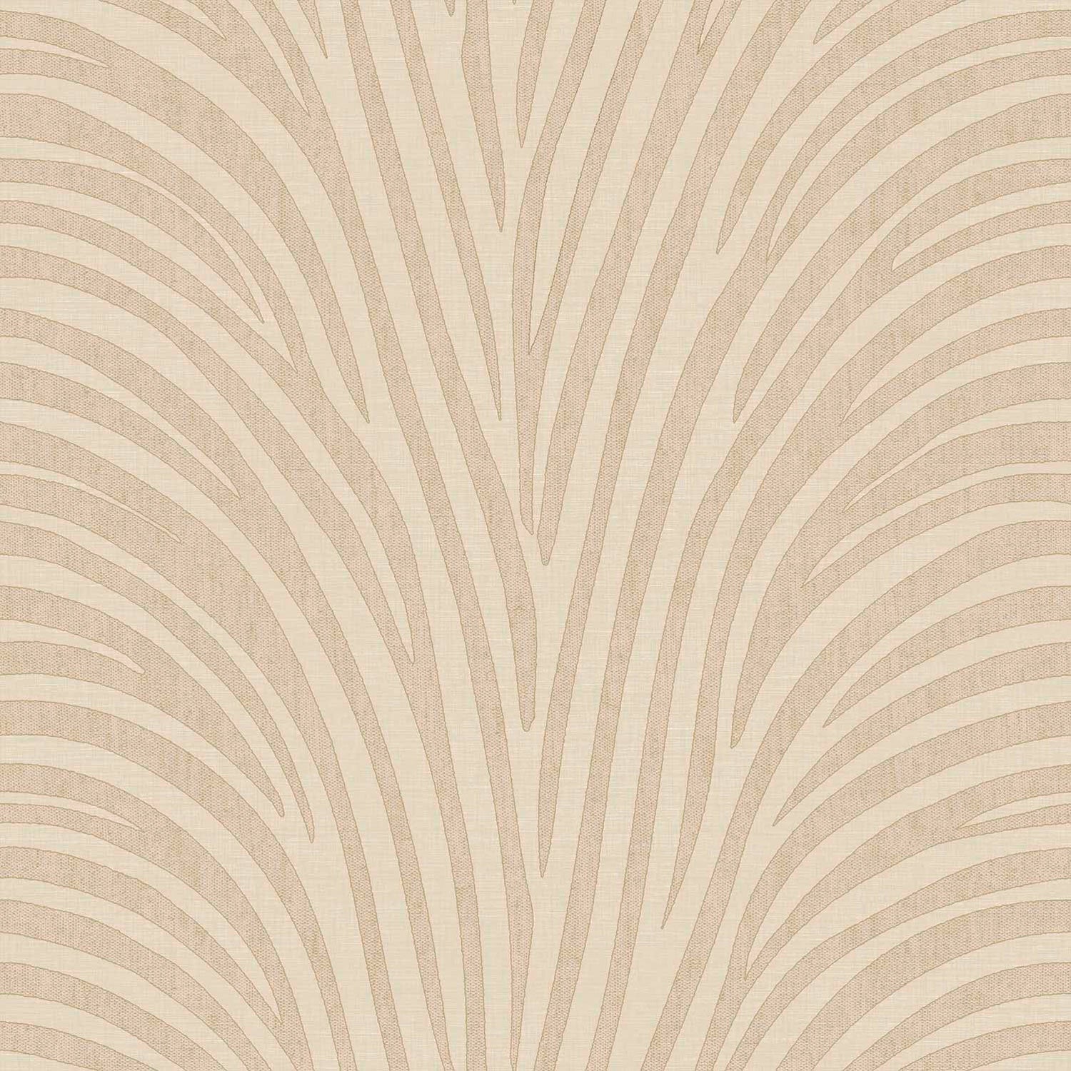 椰子の葉がモチーフになったジオメトリックデザイン。天井に伸びゆくデザインはバーチカルリピートを感じさせない計算されたパターン構成。カラーアクセントとして壁を飾っても一味違った表情を見せるに違いない。