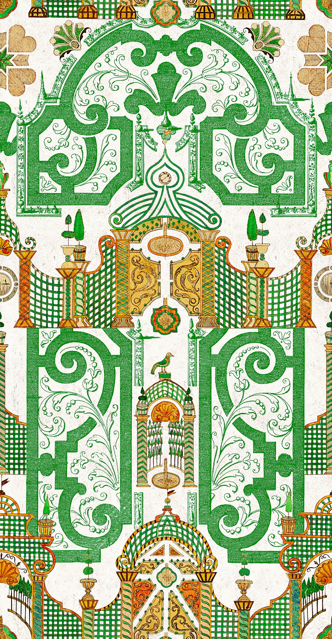 ジオメトリック柄の中に庭園モチーフが見えてきます。