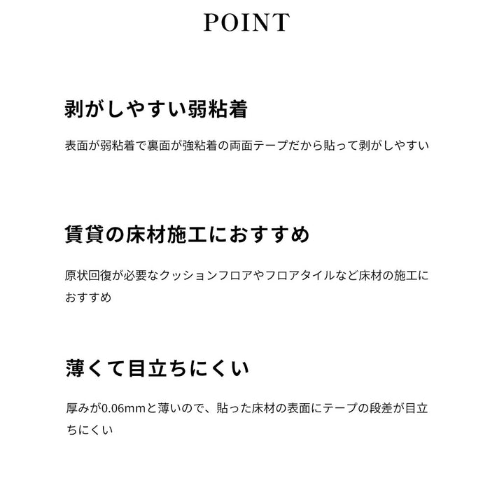 表:弱粘着 & 裏:強粘着の床材用はがせる両面テープ。