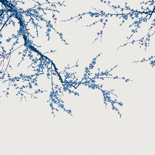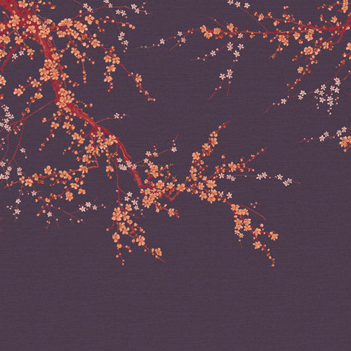 Sunset(パープル) – 深いバイオレットのような背景に、夕日の光が枝に反射してあたたかい濃いピンク色を帯びた花々が美しく映え、色彩の豊かさが壁いっぱいに広がり、空間に驚きと存在感をもたらしてくれることでしょう。