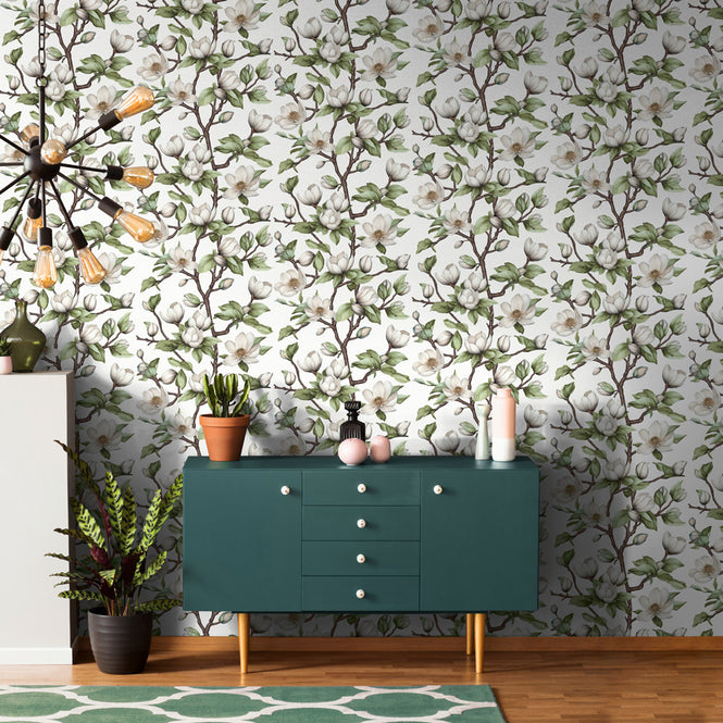 マグノリア-木蓮-の花が凛として咲いている瑞瑞しいデザイン。空に向かって咲く姿からその花言葉は「高潔な心」。リビングや寝室、玄関のウェルカムウォールに最適です。