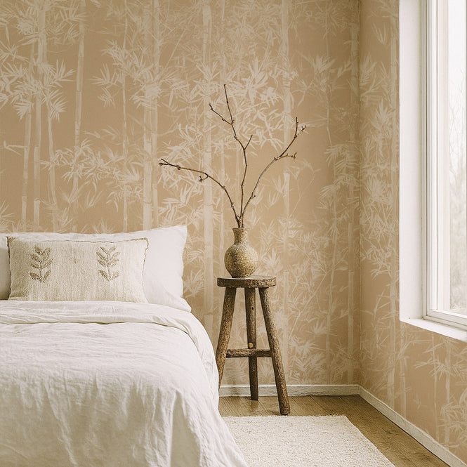日本の古都、京都 嵐山の竹林の小径から着想を得たこの壁画タイプの壁紙は、そびえ立つ竹の静寂を上品に表現しています。