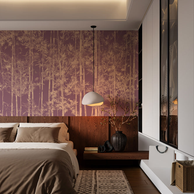 Gold Burgundy - 深いバーガンディの背景と、その上に描かれたシルクのような質感のゴールドの竹モチーフが輝きを放ちます。ゴールドとシルクの要素を組み合わせたのは、このデザインが初めて。空間に豊かさや奥行き、そして動きを与えてくれる、このカラーだけの特別仕様になっています。