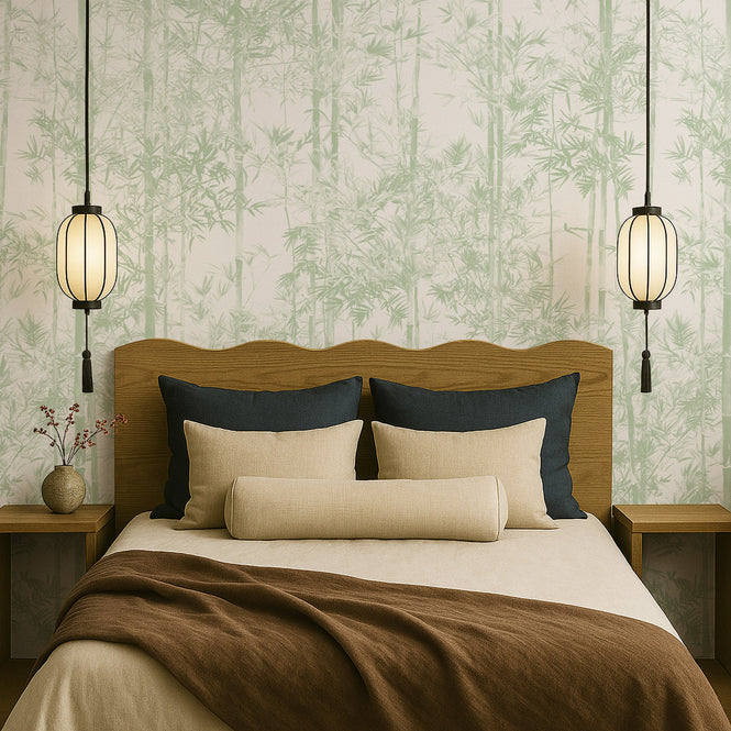日本の古都、京都 嵐山の竹林の小径から着想を得たこの壁画タイプの壁紙は、そびえ立つ竹の静寂を上品に表現しています。