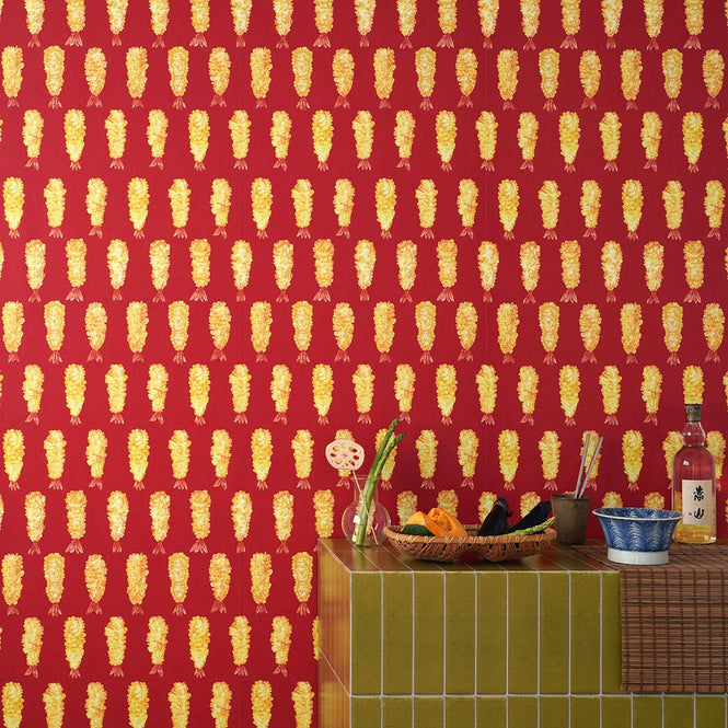 鮮やかな赤をベースにからりと揚がったえびてんがリズムよく並ぶデザインです。